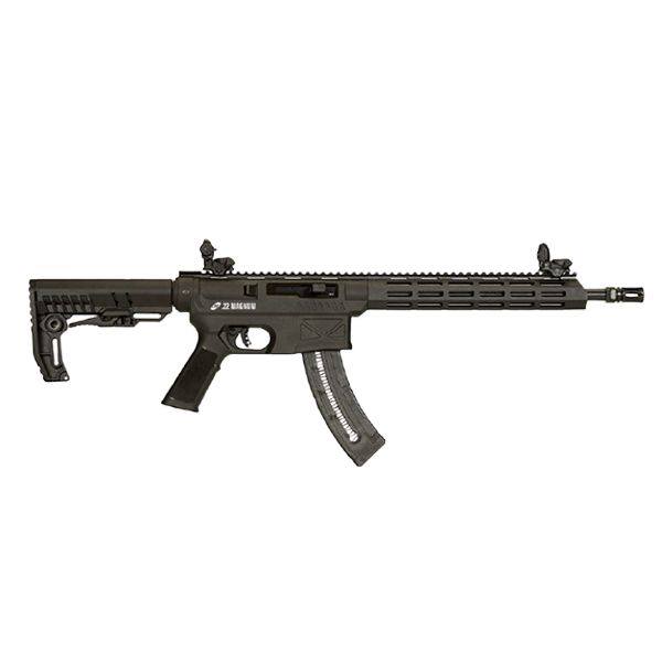 Calibre .22WMR, cano 14,5" com quebra-chamas, sistema de funcionamento semiautomático, coronha tática retrátil em polímero com 6 posições, capacidade de 25+1 disparos, Trilho Picatinny e Guarda-mão MLOK (Modular Lock) para instalação de kits ópticos, lunetas e outros acessórios. Aparelho de pontaria composto por alça e massa de mira tipo Peep Sight. Acompanha bolsa tática. Peso: 2,3 kg.